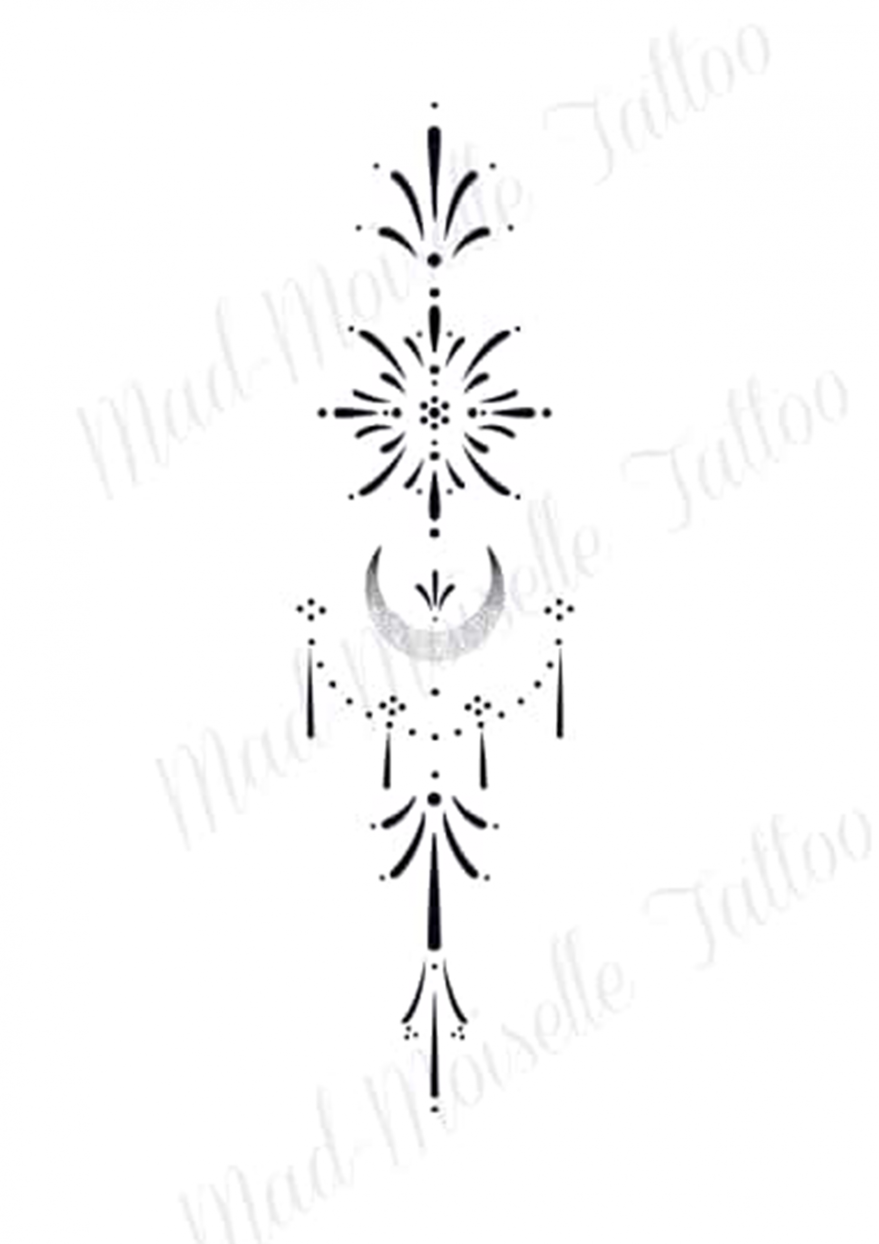 Pièce ornementale bohème au tracé fin, construite en symétrie verticale avec un travail de pointillés et un croissant de lune central façon bijou. Le motif allonge visuellement la ligne du buste et apporte une élégance délicate, entre douceur et caractère. Idéal pour sublimer le décolleté et épouser les courbes de la poitrine.